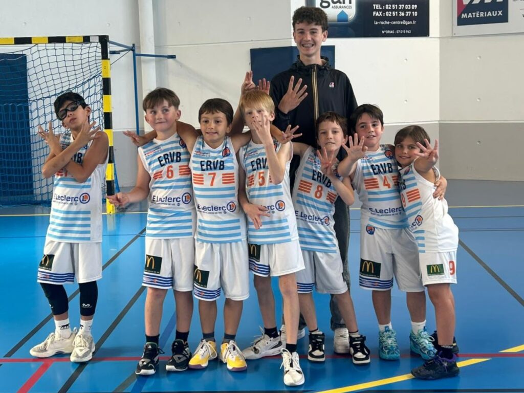 Louis MARIN (n°9), Baptiste RABILLER (n°11), Timoté BOURASSEAU n°13), Gabriel PINEAU (n°12), Sevan MENUET (n°7), Guillaume PINEAU (Coach)